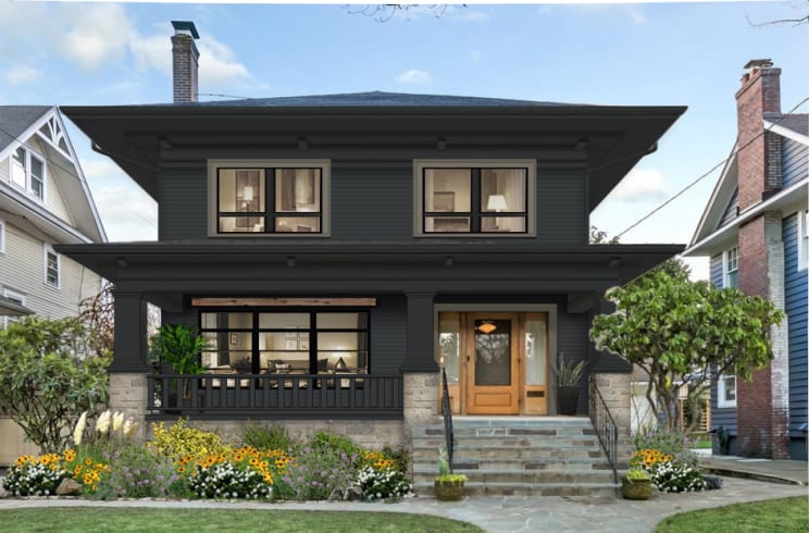 The subtle hint of. The black trim windows and the gray roof offers a fantastic contrast in the house. A soft black with blue and gray undertones.
